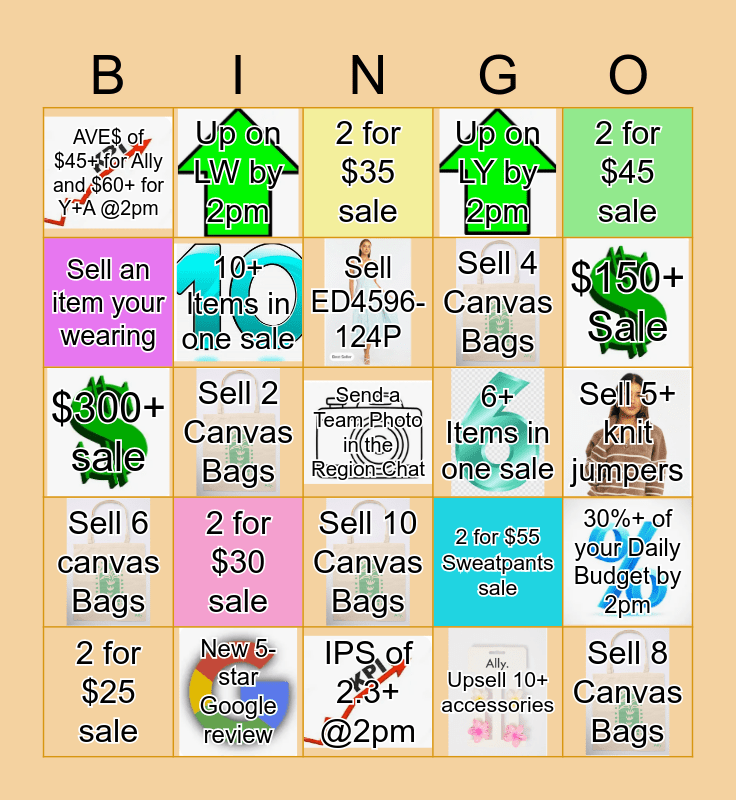 This bingo card has 18 images, a free space and 24 words: 2 for $25 sale, 2 for $30 sale, Sell ED4596-124P, Upsell 10+ accessories, 2 for $45 sale, AVE$ of $45+ for Ally and $60+ for Y+A @2pm, Up on LW by 2pm, 2 for $35 sale, 6+ Items in one sale, Sell 5+ knit jumpers, $300+ sale, 10+ Items in one sale, 2 for $55 Sweatpants sale, 30%+ of your Daily Budget by 2pm, Sell an item your wearing, New 5-star Google review, IPS of 2.3+ @2pm, Up on LY by 2pm, $150+ Sale, Sell 6 canvas Bags, Sell 2 Canvas Bags, Sell 10 Canvas Bags, Sell 4 Canvas Bags and Sell 8 Canvas Bags.