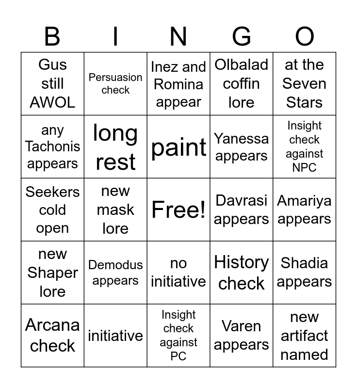 This bingo card has a free space and 40 words: Schemers cold open, Seekers cold open, Soldiers cold open, long rest, initiative, no initiative, paint, at the Hallowed Round, at the Seven Stars, new Shaper lore, new mask lore, Olbalad coffin lore, new artifact named, Amariya appears, Davrasi appears, Demodus appears, Gus appears, Gus still AWOL, Harondus appears, Inez and Romina appear, Shadia appears, Varen appears, Yanessa appears, any Tachonis appears, Hound of the King named, new NPC appears, Seeker mention outside of open, Soldier mention outside of open, Detect Magic, Bardic Inspiration, Portent used, Arcana check, Deception check, History check, Insight check against NPC, Insight check against PC, Investigation check, Perception check, Persuasion check and Ellipides appears.