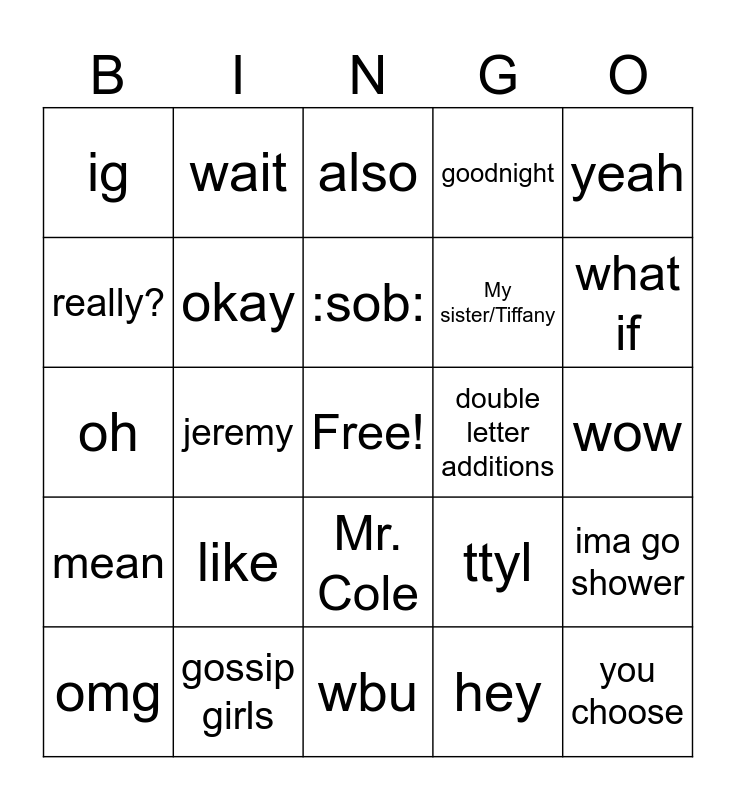 This bingo card has a free space and 24 words: omg, like, :sob:, hey, yeah, ig, wait, also, double letter additions, wow, oh, okay, ttyl, ima go shower, really?, gossip girls, wbu, goodnight, what if, mean, jeremy, Mr. Cole, My sister/Tiffany and you choose.
