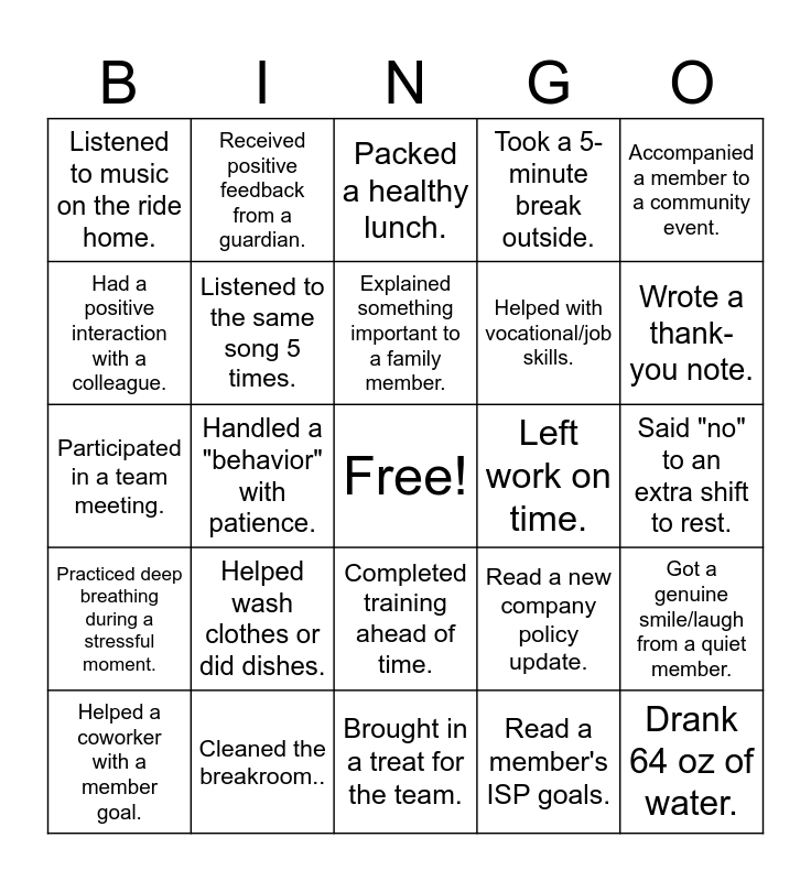This bingo card has a free space and 38 words: Successfully de-escalated a difficult situation., Did a craft project., Accompanied a member to a doctor’s appointment., Listened to the same song 5 times., Got a genuine smile/laugh from a quiet member., Helped wash clothes or did dishes., Explained something important to a family member., Reminded someone to take their medication., Accompanied a member to a community event., Helped with vocational/job skills., Handled a "behavior" with patience., Took a 5-minute break outside., Drank 64 oz of water., Said "no" to an extra shift to rest., Had a positive interaction with a colleague., Practiced deep breathing during a stressful moment., Drank a coffee/tea while it was still hot., Packed a healthy lunch., Complimented a coworker., Left work on time., Listened to music on the ride home., Cleaned the breakroom.., Wrote a thank-you note., Helped a coworker with a member goal., Covered a member -wellness check for someone., Brought in a treat for the team., Shared a positive memwber story with the team, Helped a colleague with documentation., Organized a fun activity a member., Celebrated a member's birthday., Shared a helpful resource or tip with a co-worker.., Completed training ahead of time., Read a member's ISP goals., Received positive feedback from a guardian., Demonstrated a new skill., Read a new company policy update., Participated in a team meeting. and Helped orient a new hire..