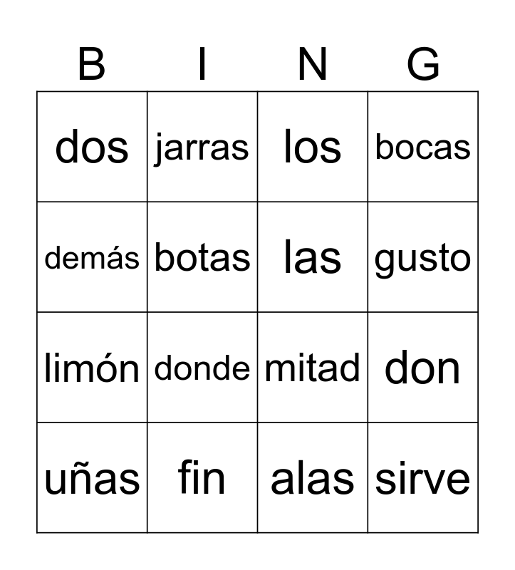 This bingo card has 31 words: ¡Gratis!, son, don, pan, dos, los, las, por, fin, uvas, alas, uñas, ellos, casco, donde, carne, piden, latas, sirve, cunas, demás, lunas, toman, jarras, limón, botas, bocas, mitad, gorras, gusto and mesas.