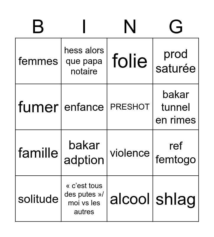 This bingo card has 16 words: « c’est tous des putes »/ moi vs les autres, ref femtogo, folie, femmes, famille, hess alors que papa notaire, violence, alcool, fumer, enfance, solitude, prod saturée, bakar adption, bakar tunnel en rimes, PRESHOT and shlag.