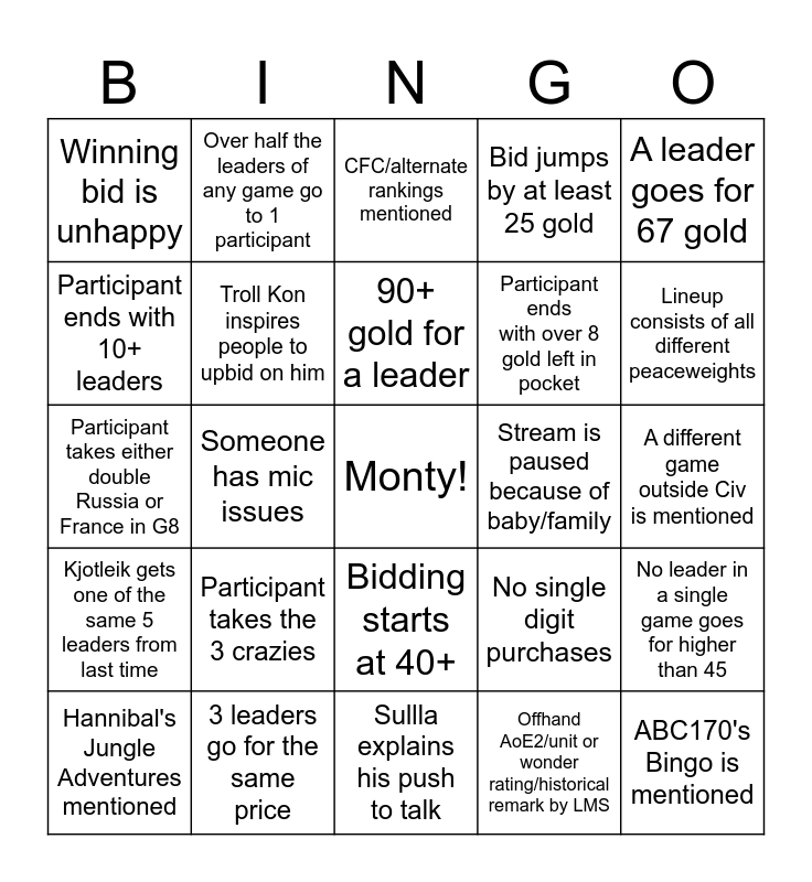This bingo card has a free space and 24 words: Participant takes the 3 crazies, 3 leaders go for the same price, 90+ gold for a leader, Hannibal's Jungle Adventures mentioned, A leader goes for 67 gold, Winning bid is unhappy, Participant ends with 10+ leaders, Over half the leaders of any game go to 1 participant, Stream is paused because of baby/family, Bidding starts at 40+, Participant ends with over 8 gold left in pocket, Participant takes either double Russia or France in G8, No single digit purchases, No leader in a single game goes for higher than 45, Troll Kon inspires people to upbid on him, Offhand AoE2/unit or wonder rating/historical remark by LMS, A different game outside Civ is mentioned, CFC/alternate rankings mentioned, Lineup consists of all different peaceweights, Someone has mic issues, ABC170's Bingo is mentioned, Kjotleik gets one of the same 5 leaders from last time, Bid jumps by at least 25 gold and Sullla explains his push to talk.