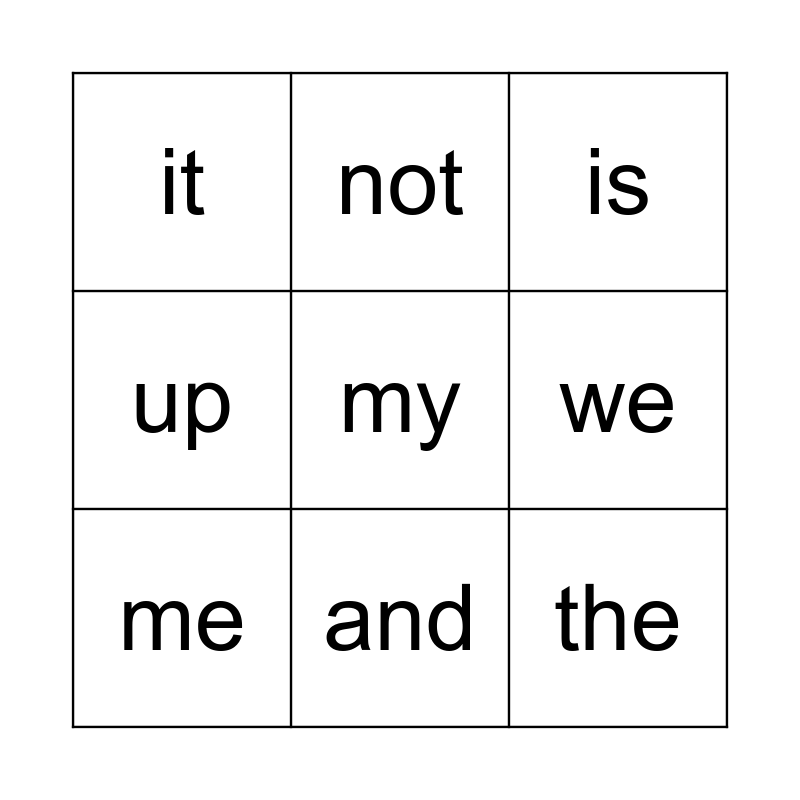 This bingo card has 18 words: a, I, is, it, in, up, can, not, and, the, see, my, for, we, me, go, play and jump.