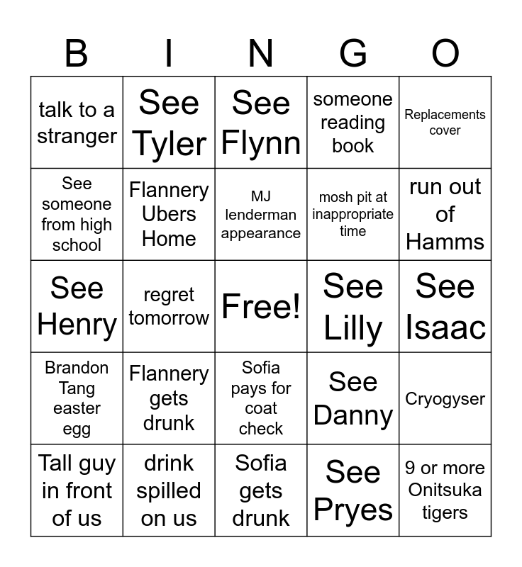 This bingo card has a free space and 24 words: Flannery gets drunk, drink spilled on us, MJ lenderman appearance, Tall guy in front of us, Replacements cover, talk to a stranger, See someone from high school, See Tyler, See Lilly, Sofia pays for coat check, mosh pit at inappropriate time, See Henry, See Danny, Cryogyser, Flannery Ubers Home, See Pryes, See Isaac, See Flynn, run out of Hamms, regret tomorrow, 9 or more Onitsuka tigers, Brandon Tang easter egg, someone reading book and Sofia gets drunk.