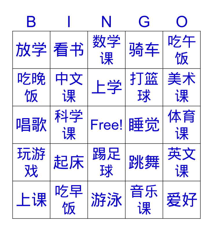 This bingo card has a free space and 24 words: 起床, 吃早饭, 上学, 上课, 吃午饭, 放学, 吃晚饭, 看书, 睡觉, 踢足球, 打篮球, 唱歌, 跳舞, 英文课, 中文课, 音乐课, 体育课, 数学课, 美术课, 科学课, 爱好, 玩游戏, 骑车 and 游泳.