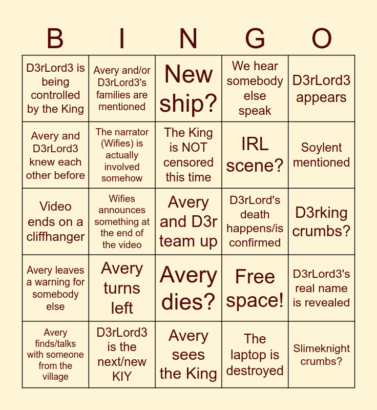 This bingo card has 25 words: Avery turns left, Avery sees the King, The King is NOT censored this time, Avery finds/talks with someone from the village, D3rLord3 appears, D3rLord3 is being controlled by the King, Avery and D3rLord3 knew each other before, Avery and/or D3rLord3's families are mentioned, D3rLord's death happens/is confirmed, Avery dies?, IRL scene?, Video ends on a cliffhanger, Free space!, D3rLord3's real name is revealed, The narrator (Wifies) is actually involved somehow, Slimeknight crumbs?, D3rking crumbs?, New ship?, Soylent mentioned, Wifies announces something at the end of the video, Avery and D3r team up, D3rLord3 is the next/new KIY, Avery leaves a warning for somebody else, We hear somebody else speak and The laptop is destroyed.