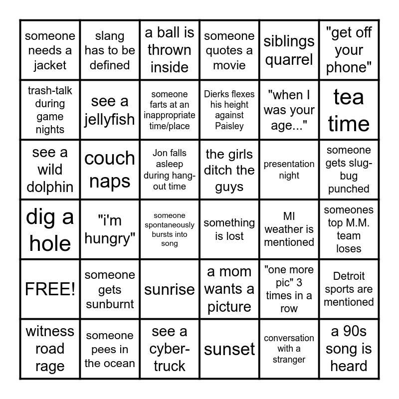 This bingo card has 43 words: a 90s song is heard, see a wild dolphin, a brother asks for fast food, someone spontaneously bursts into song, a mom wants a picture, someones top M.M. team loses, a ball is thrown inside, Kevin on the balcony w/ coffee, siblings quarrel, something is lost, someone quotes a movie, couch naps, someone gets slug-bug punched, presentation night, see a cyber-truck, MI weather is mentioned, Detroit sports are mentioned, "when I was your age...", someone drops a roll, Dierks flexes his height against Paisley, slang has to be defined, witness road rage, "one more pic" 3 times in a row, someone needs a jacket, something is forgotten, Jon falls asleep during hang-out time, someone gets sunburnt, make a sandcastle, dig a hole, the girls ditch the guys, someone gets chicken tenders at a restaurant, "i'm hungry", someone pees in the ocean, tea time, sunrise, sunset, FREE!, see a jellyfish, "get off your phone", someone farts at an inappropriate time/place, conversation with a stranger, trash-talk during game nights and someone has a laughing fit.