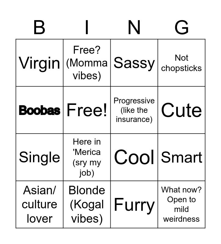 This bingo card has 16 words: Blonde (Kogal vibes), Smart, Sassy, Virgin, Single, Free? (Momma vibes), Cool, Furry, Boobas, Free!, Asian/ culture lover, Not chopsticks, Here in 'Merica (sry my job), Cute, Progressive (like the insurance) and What now? Open to mild weirdness.