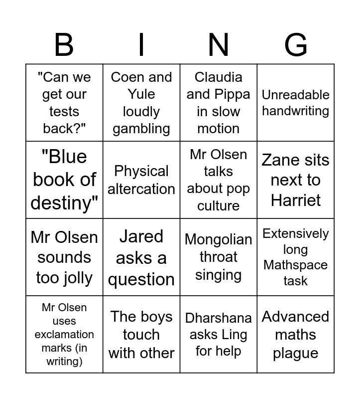This bingo card has 16 words: The boys touch with other, Extensively long Mathspace task, Claudia and Pippa in slow motion, "Can we get our tests back?", Mr Olsen sounds too jolly, Coen and Yule loudly gambling, Mongolian throat singing, Dharshana asks Ling for help, "Blue book of destiny", Physical altercation, Mr Olsen uses exclamation marks (in writing), Unreadable handwriting, Jared asks a question, Zane sits next to Harriet, Mr Olsen talks about pop culture and Advanced maths plague.