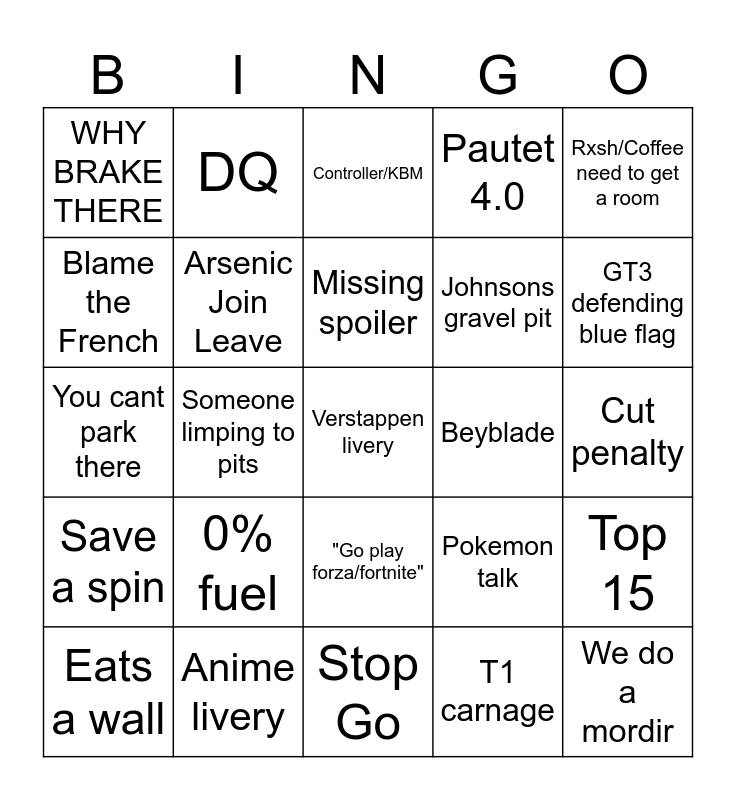 This bingo card has a free space and 50 words: Verstappen do mordir, We do a mordir, Drive Thru, Stop Go, 0% fuel, 10+ DNF, DQ, Blue flag talk, Blame the French, We repair damage, Arsenic Join Leave, Pautet 4.0, Top 15, Pokemon talk, Lawn mower, Missing tire, Missing spoiler, Beyblade, Excessively toxic chat, Rxsh/Coffee need to get a room, Someone limping to pits, T1 carnage, WHY BRAKE THERE, Johnsons gravel pit, We hear Lucy's TikToks, GT3 beating Hyper, GT3 defending blue flag, Front left over 95 degrees, Controller/KBM, "Go play forza/fortnite", Rage DNF, Unsafe rejoinly, Emergency pee/poo, 6 7, Anime livery, DNF lap 1, Flat spot, Cocky/Ego, Pit limiter penalty, Cut penalty, Good fighting, Excessive flashing, Dive bomb to pit, Someone soloing it, Eats a wall, You cant park there, Rexxy multiverse, Johnson random AFK, Save a spin and Bad driving (intent wreck-ish).