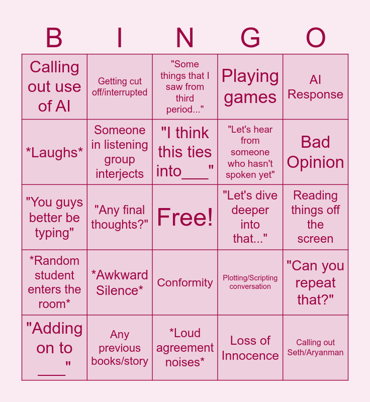 This bingo card has a free space and 26 words: Conformity, Loss of Innocence, "I think this ties into___", Any previous books/story, AI Response, Calling out use of AI, *Laughs*, Getting cut off/interrupted, Reading things off the screen, Plotting/Scripting conversation, "Let's hear from someone who hasn't spoken yet", "You guys better be typing", "Can you repeat that?", "Adding on to ___", "Any final thoughts?", Off topic conversations, Playing games, *Random student enters the room*, "Some things that I saw from third period...", Calling out Seth/Aryanman, Bad Opinion, *Loud agreement noises*, "Let's dive deeper into that...", *Awkward Silence*, Someone in listening group interjects and "Did I get full credit?".