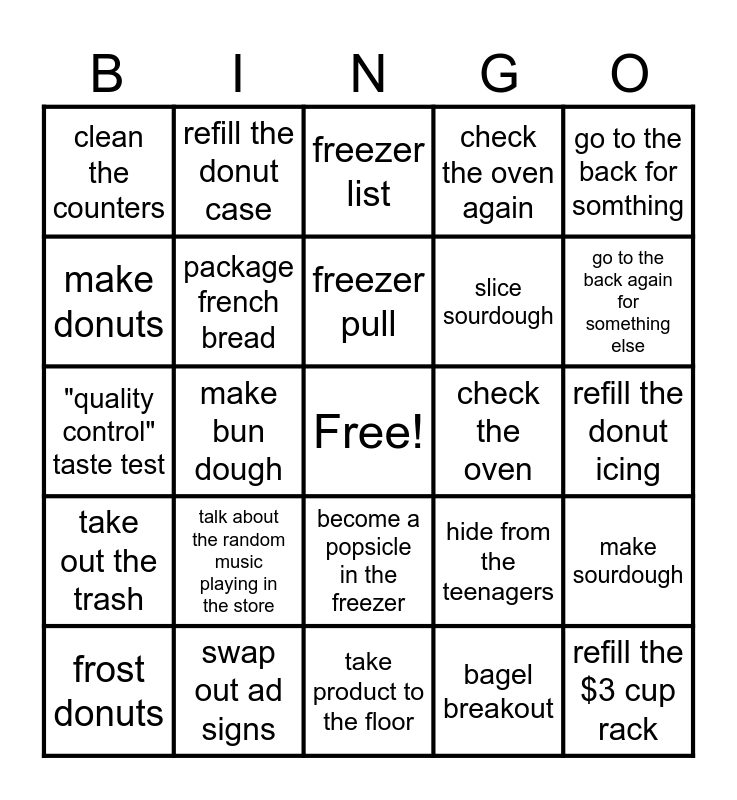 This bingo card has a free space and 34 words: cookie breakout, bagel breakout, dishes, cardboard, take out the trash, package french bread, go to the back for somthing, frost donuts, refill the donut case, more dishes, freezer pull, freezer list, face the shelves, package cookies, check the oven, go to the back again for something else, swap out ad signs, "quality control" taste test, talk about the random music playing in the store, hide from the teenagers, become a popsicle in the freezer, navigate an obstacle course of racks, clean the counters, refill the donut icing, take product to the floor, refill the $3 cup rack, check the oven again, arrive "dark and early", slice sourdough, make donuts, make french dough, make bun dough, make sourdough and sweep/mop.