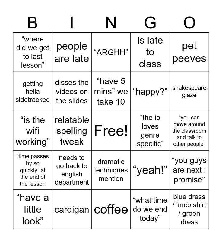 This bingo card has a free space and 24 words: needs to go back to english department, cardigan, “have 5 mins” we take 10, “have a little look”, pet peeves, “where did we get to last lesson”, getting hella sidetracked, people are late, “the ib loves genre specific”, dramatic techniques mention, “happy?”, “is the wifi working”, “yeah!”, “you guys are next i promise”, disses the videos on the slides, “what time do we end today”, “you can move around the classroom and talk to other people”, “ARGHH”, shakespeare glaze, relatable spelling tweak, blue dress / lmcb shirt / green dress, “time passes by so quickly” at the end of the lesson, is late to class and coffee.