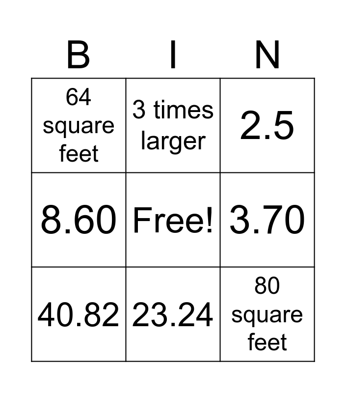 This bingo card has a free space and 17 words: 250 miles, 9.42, 2.5, 64 square feet, 2 times smaller, 8.60, 192 square feet, 40.82, 23.24, 3.70, 2 units, 5.50, 80 square feet, 3 times larger, 150 miles, 15 units and 72.22.