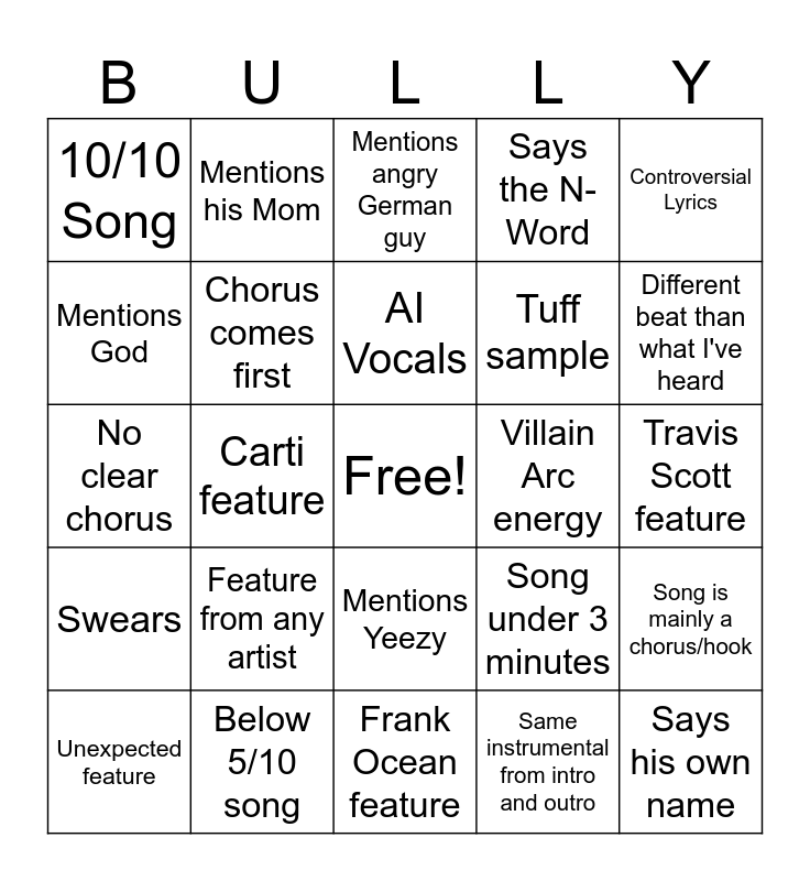 This bingo card has a free space and 24 words: Feature from any artist, Below 5/10 song, AI Vocals, Unexpected feature, Controversial Lyrics, 10/10 Song, Mentions God, Mentions his Mom, Villain Arc energy, Mentions Yeezy, Tuff sample, No clear chorus, Song under 3 minutes, Song is mainly a chorus/hook, Chorus comes first, Same instrumental from intro and outro, Travis Scott feature, Mentions angry German guy, Different beat than what I've heard, Carti feature, Says his own name, Swears, Says the N-Word and Frank Ocean feature.