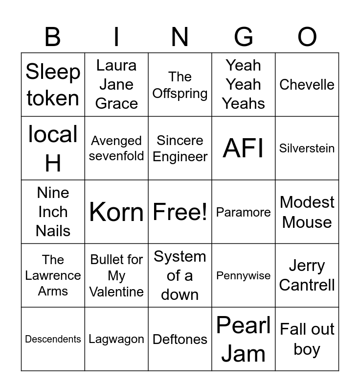 This bingo card has a free space and 24 words: Descendents, Bullet for My Valentine, Sincere Engineer, Pearl Jam, Chevelle, Sleep token, Laura Jane Grace, The Offspring, Paramore, Modest Mouse, Nine Inch Nails, Avenged sevenfold, Pennywise, Jerry Cantrell, local H, Lagwagon, Deftones, Yeah Yeah Yeahs, Silverstein, The Lawrence Arms, Korn, System of a down, AFI and Fall out boy.