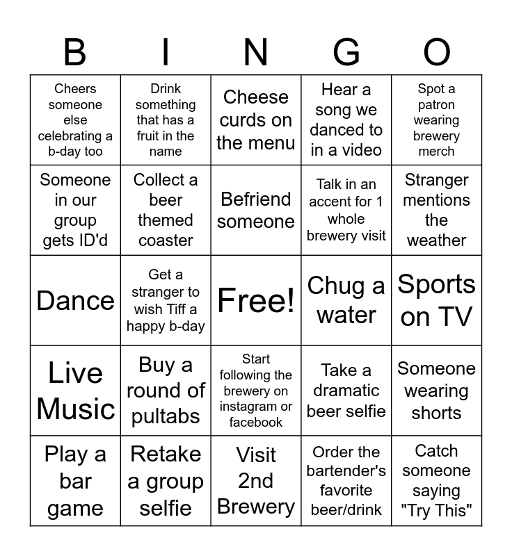 This bingo card has a free space and 24 words: Buy a round of pultabs, Retake a group selfie, Befriend someone, Play a bar game, Spot a patron wearing brewery merch, Cheers someone else celebrating a b-day too, Someone in our group gets ID'd, Drink something that has a fruit in the name, Chug a water, Start following the brewery on instagram or facebook, Talk in an accent for 1 whole brewery visit, Dance, Take a dramatic beer selfie, Someone wearing shorts, Collect a beer themed coaster, Order the bartender's favorite beer/drink, Sports on TV, Cheese curds on the menu, Stranger mentions the weather, Get a stranger to wish Tiff a happy b-day, Catch someone saying "Try This", Live Music, Hear a song we danced to in a video and Visit 2nd Brewery.