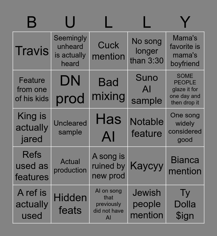 This bingo card has a free space and 24 words: Actual production, Hidden feats, Bad mixing, A ref is actually used, Mama's favorite is mama's boyfriend, Travis, Feature from one of his kids, Seemingly unheard is actually heard, Notable feature, A song is ruined by new prod, Suno AI sample, King is actually jared, Kaycyy, Bianca mention, DN prod, Jewish people mention, One song widely considered good, Cuck mention, SOME PEOPLE glaze it for one day and then drop it, Uncleared sample, Ty Dolla $ign, Refs used as features, No song longer than 3:30 and AI on song that previously did not have AI.
