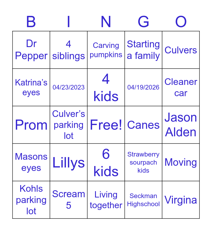 This bingo card has a free space and 24 words: Lillys, Scream 5, 4 kids, Kohls parking lot, Culvers, Dr Pepper, Katrina’s eyes, 4 siblings, Canes, 6 kids, 04/19/2026, Prom, Strawberry sourpach kids, Moving, 04/23/2023, Seckman Highschool, Jason Alden, Carving pumpkins, Cleaner car, Culver’s parking lot, Virgina, Masons eyes, Starting a family and Living together.
