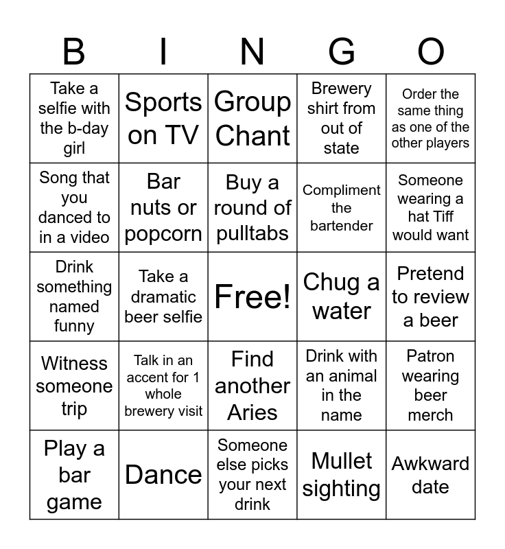 This bingo card has a free space and 24 words: Talk in an accent for 1 whole brewery visit, Dance, Buy a round of pulltabs, Play a bar game, Order the same thing as one of the other players, Take a selfie with the b-day girl, Song that you danced to in a video, Sports on TV, Chug a water, Find another Aries, Compliment the bartender, Drink something named funny, Drink with an animal in the name, Patron wearing beer merch, Bar nuts or popcorn, Mullet sighting, Pretend to review a beer, Group Chant, Someone wearing a hat Tiff would want, Take a dramatic beer selfie, Awkward date, Witness someone trip, Brewery shirt from out of state and Someone else picks your next drink.