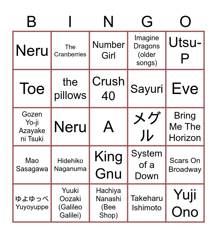This bingo card has a free space and 24 words: Hidehiko Naganuma, Yuuki Oozaki (Galileo Galilei), Crush 40, ゆよゆっぺ Yuyoyuppe, Utsu-P, Neru, Toe, The Cranberries, メグル, King Gnu, Sayuri, Gozen Yo-ji Azayake ni Tsuki, System of a Down, Scars On Broadway, the pillows, Takeharu Ishimoto, Bring Me The Horizon, Number Girl, Eve, Neru, Yuji Ono, Mao Sasagawa, Imagine Dragons (older songs) and Hachiya Nanashi (Bee Shop).