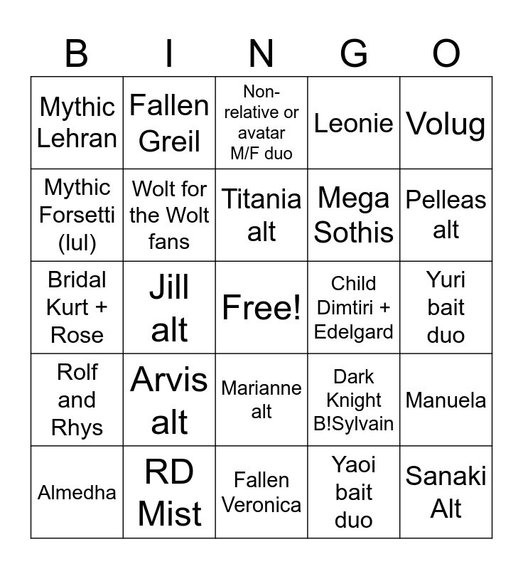 This bingo card has a free space and 24 words: Arvis alt, RD Mist, Titania alt, Almedha, Volug, Mythic Lehran, Mythic Forsetti (lul), Fallen Greil, Child Dimtiri + Edelgard, Marianne alt, Mega Sothis, Bridal Kurt + Rose, Dark Knight B!Sylvain, Manuela, Wolt for the Wolt fans, Yaoi bait duo, Yuri bait duo, Non-relative or avatar M/F duo, Pelleas alt, Jill alt, Sanaki Alt, Rolf and Rhys, Leonie and Fallen Veronica.