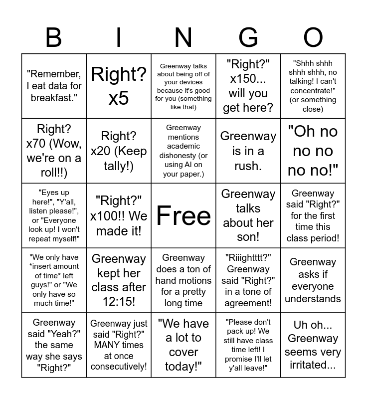 This bingo card has a free space and 24 words: Greenway kept her class after 12:15!, Greenway just said "Right?" MANY times at once consecutively!, Greenway mentions academic dishonesty (or using AI on your paper.), Greenway said "Yeah?" the same way she says "Right?", "Shhh shhh shhh shhh, no talking! I can't concentrate!" (or something close), "Remember, I eat data for breakfast.", Right? x70 (Wow, we're on a roll!!), Right? x5, Greenway talks about her son!, Greenway does a ton of hand motions for a pretty long time, Greenway is in a rush., "Eyes up here!", "Y'all, listen please!", or "Everyone look up! I won't repeat myself!", "Riiightttt?" Greenway said "Right?" in a tone of agreement!, Greenway asks if everyone understands, Right? x20 (Keep tally!), "Please don't pack up! We still have class time left! I promise I'll let y'all leave!", Greenway said "Right?" for the first time this class period!, Greenway talks about being off of your devices because it's good for you (something like that), "Oh no no no no no!", "Right?" x100!! We made it!, Uh oh... Greenway seems very irritated..., "We only have *insert amount of time* left guys!" or "We only have so much time!", "Right?" x150... will you get here? and "We have a lot to cover today!".