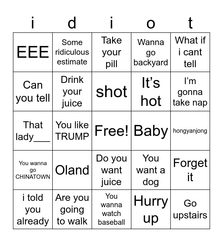 This bingo card has a free space and 30 words: Are you going to walk, Walk again, You like TRUMP, what a mess, EEE, Take your pill, Drink your juice, Do you want juice, Baby, You wanna watch baseball, hongyanjong, Go upstairs, Hurry up, What about you, I’m gonna take nap, Don’t need to brush teeth, You want a dog, You wanna go CHINATOWN, Oland, What if i cant tell, That lady___, That man____, Some ridiculous estimate, It’s hot, Can you tell, Wanna go backyard, Forget it, i told you already, shot and killed.