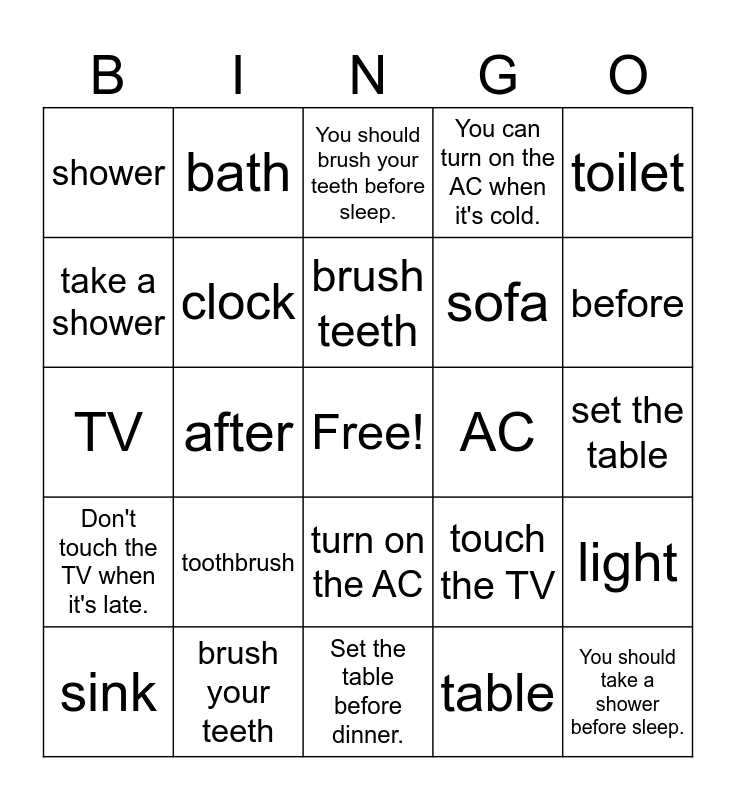 This bingo card has a free space and 24 words: toothbrush, brush your teeth, brush teeth, sink, toilet, shower, take a shower, bath, AC, turn on the AC, sofa, TV, touch the TV, light, clock, table, set the table, You should brush your teeth before sleep., before, after, You should take a shower before sleep., Don't touch the TV when it's late., You can turn on the AC when it's cold. and Set the table before dinner..