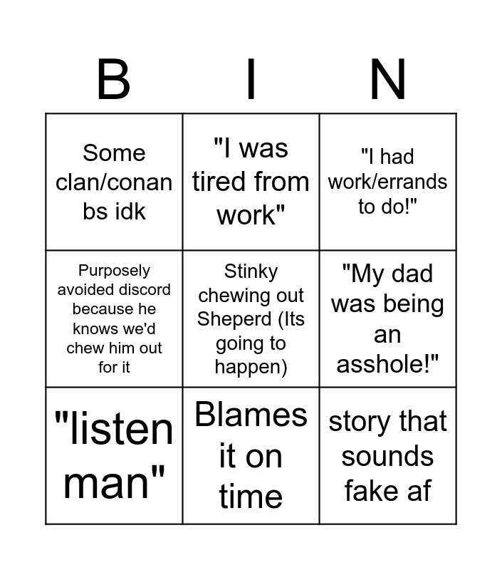 This bingo card has a free space and 8 words: "My dad was being an asshole!", "I had work/errands to do!", "I was tired from work", "listen man", Some clan/conan bs idk, story that sounds fake af, Purposely avoided discord because he knows we'd chew him out for it and Blames it on time.
