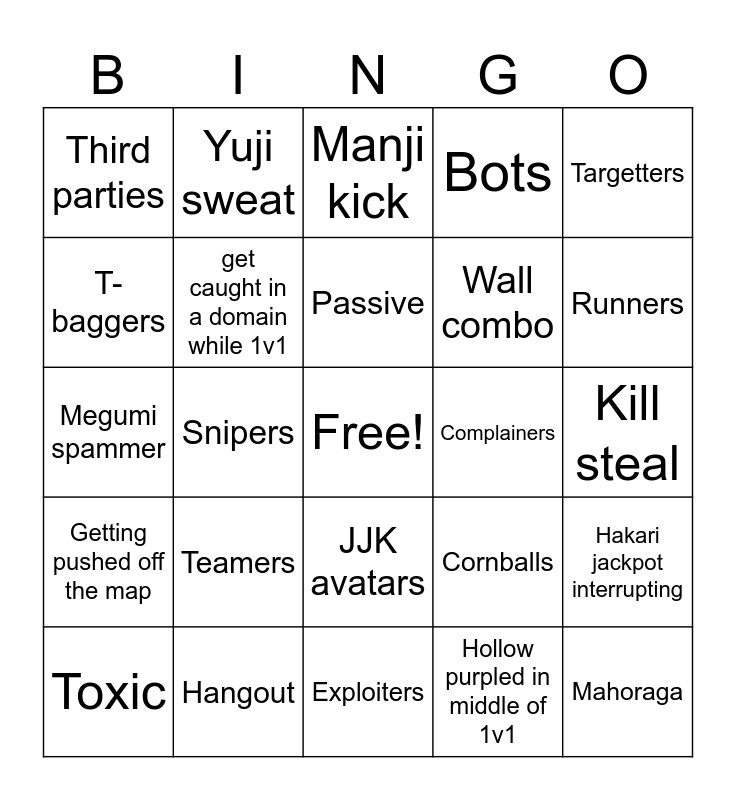 This bingo card has a free space and 24 words: Teamers, Hangout, Passive, Toxic, Targetters, Third parties, T-baggers, Yuji sweat, Complainers, JJK avatars, Wall combo, Megumi spammer, Cornballs, Hakari jackpot interrupting, get caught in a domain while 1v1, Hollow purpled in middle of 1v1, Kill steal, Manji kick, Runners, Snipers, Mahoraga, Getting pushed off the map, Bots and Exploiters.