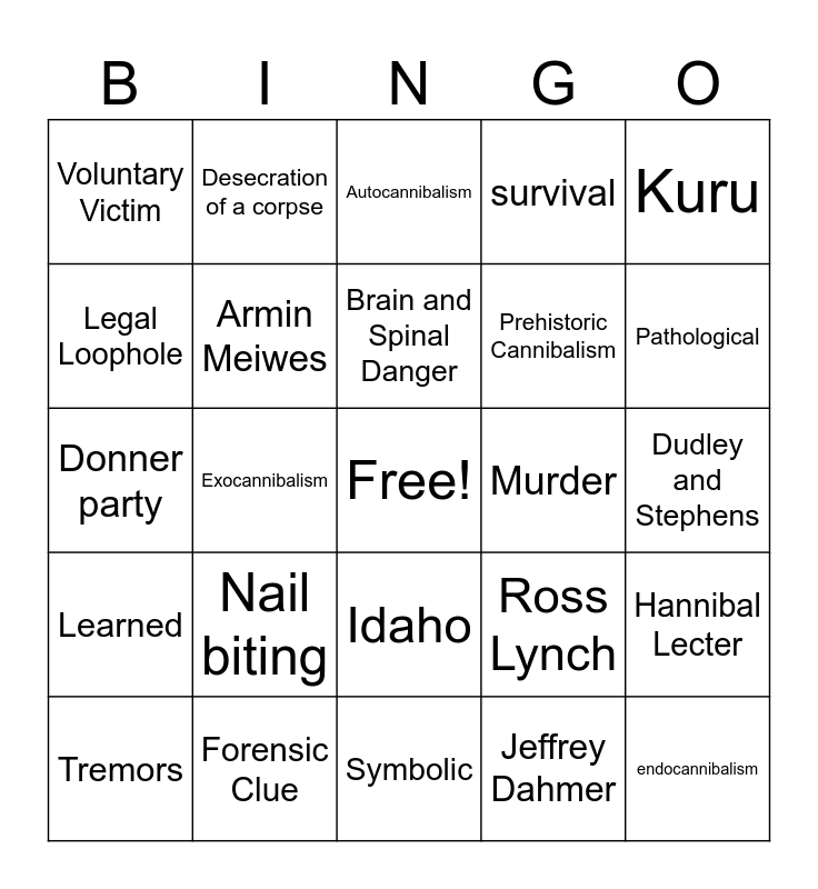 This bingo card has a free space and 24 words: Nail biting, Forensic Clue, Brain and Spinal Danger, Tremors, Kuru, Voluntary Victim, Legal Loophole, Desecration of a corpse, Murder, Idaho, Prehistoric Cannibalism, Donner party, Ross Lynch, Hannibal Lecter, Armin Meiwes, Jeffrey Dahmer, Dudley and Stephens, Autocannibalism, Pathological, Exocannibalism, endocannibalism, Learned, survival and Symbolic.