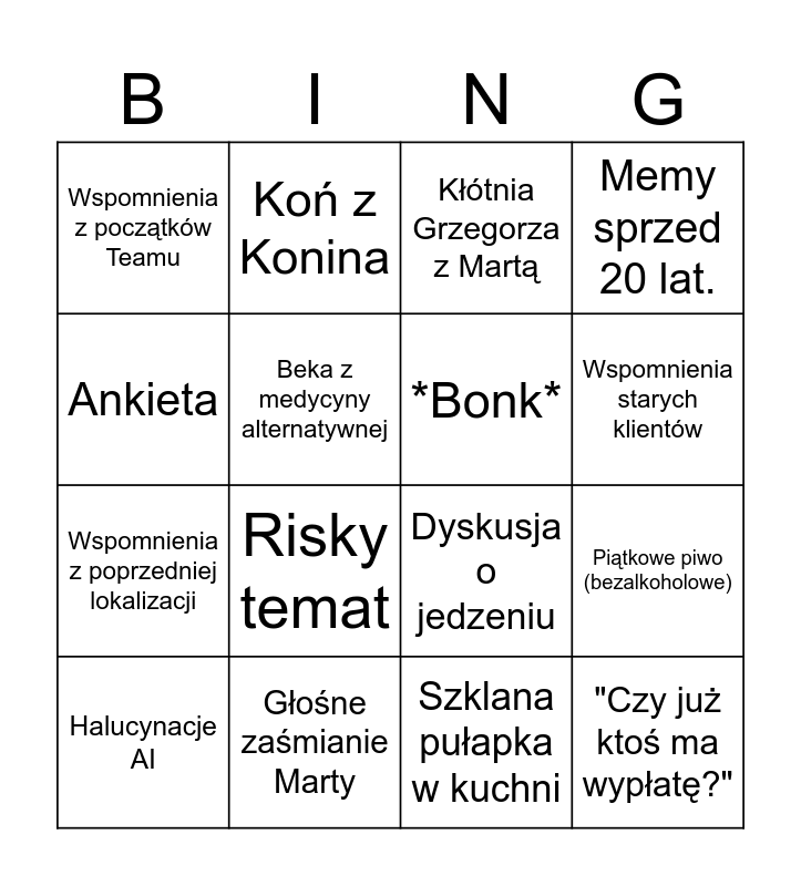 This bingo card has 16 words: Głośne zaśmianie Marty, Piątkowe piwo (bezalkoholowe), Kłótnia Grzegorza z Martą, Wspomnienia z początków Teamu, Wspomnienia z poprzedniej lokalizacji, Koń z Konina, Dyskusja o jedzeniu, Szklana pułapka w kuchni, Ankieta, Beka z medycyny alternatywnej, Halucynacje AI, Memy sprzed 20 lat., Risky temat, Wspomnienia starych klientów, *Bonk* and "Czy już ktoś ma wypłatę?".