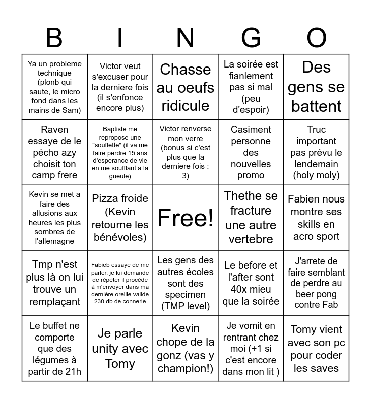 This bingo card has a free space and 24 words: Fabieb essaye de me parler, je lui demande de répéter il procède à m'envoyer dans ma dernière oreille valide 230 db de connerie, Je parle unity avec Tomy, Victor renverse mon verre (bonus si c'est plus que la derniere fois : 3), Le buffet ne comporte que des légumes à partir de 21h, Des gens se battent, Ya un probleme technique (plonb qui saute, le micro fond dans les mains de Sam), Raven essaye de le pécho azy choisit ton camp frere, Victor veut s'excuser pour la derniere fois (il s'enfonce encore plus), Thethe se fracture une autre vertebre, Les gens des autres écoles sont des specimen (TMP level), Casiment personne des nouvelles promo, Kevin se met a faire des allusions aux heures les plus sombres de l'allemagne, Le before et l'after sont 40x mieu que la soirée, J'arrete de faire semblant de perdre au beer pong contre Fab, Baptiste me repropose une "souflette" (il va me faire perdre 15 ans d'esperance de vie en me soufflant a la gueule), Je vomit en rentrant chez moi (+1 si c'est encore dans mon lit ), Fabien nous montre ses skills en acro sport, Chasse au oeufs ridicule, Truc important pas prévu le lendemain (holy moly), Pizza froide (Kevin retourne les bénévoles), Tomy vient avec son pc pour coder les saves, Tmp n'est plus là on lui trouve un remplaçant, La soirée est fianlement pas si mal (peu d'espoir) and Kevin chope de la gonz (vas y champion!).
