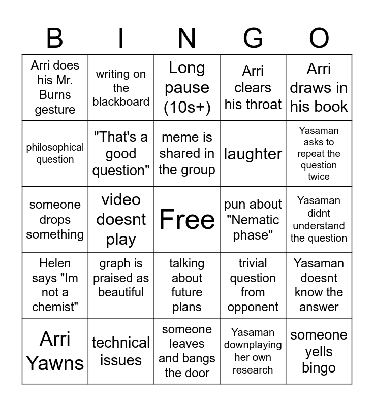 This bingo card has a free space and 24 words: graph is praised as beautiful, technical issues, meme is shared in the group, Arri Yawns, Arri draws in his book, Arri does his Mr. Burns gesture, philosophical question, writing on the blackboard, pun about "Nematic phase", talking about future plans, laughter, someone drops something, trivial question from opponent, Yasaman doesnt know the answer, "That's a good question", Yasaman downplaying her own research, Yasaman didnt understand the question, Long pause (10s+), Yasaman asks to repeat the question twice, video doesnt play, someone yells bingo, Helen says "Im not a chemist", Arri clears his throat and someone leaves and bangs the door.