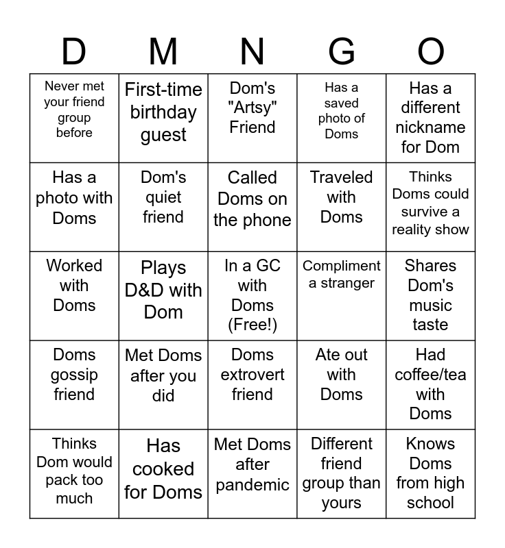 This bingo card has a free space and 49 words: Knows Doms from college, Knows Doms from high school, Met Doms through a friend, Met Doms after pandemic, Met Doms after you did, Met Doms before you did, First-time birthday guest, Been to Doms birthday before, Has a photo with Doms, Has a selfie with Doms, Dom's quiet friend, Has a saved photo of Doms, Had coffee/tea with Doms, Ate out with Doms, Shared a meal with Doms, Got ready with Doms, Called Doms on the phone, Compliment a stranger, Be completed by a stranger, Has a different nickname for Dom, Plays D&D with Dom, Different friend group than yours, Never met your friend group before, Traveled with Doms, Thinks Doms could win a debate, Thinks Doms could survive a reality show, Thinks Dom would pack too much, Knows Dom would pack too much, Doms extrovert friend, Doms gossip friend, Birthday is in the same month as Doms, Dom's organized friend, Dom's well-dressed friend, Doms impulse-buy friend, Has cooked for Doms, Has eaten Dom's cooking, Did KTV with Doms, Doms horror-movie friend, Shares Dom's music taste, Dom's low maintenance friend, Dom's TALL friend (5'5"+), Dom's FUN-SIZED friend (<5'1"), Dom's Sporty Friend, Placed a sticker on Doms, Worked with Doms, Dom's "Artsy" Friend, Pet Owner Friend, Doesn't like spicy food and Also likes spicy food.