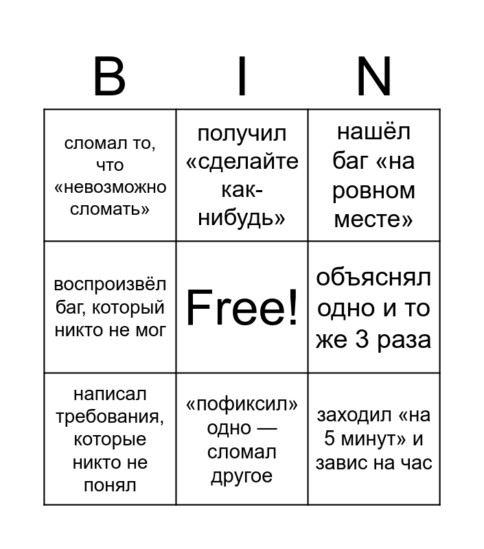 This bingo card has a free space and 10 words: «пофиксил» одно — сломал другое, нашёл баг «на ровном месте», сломал то, что «невозможно сломать», заходил «на 5 минут» и завис на час, воспроизвёл баг, который никто не мог, написал требования, которые никто не понял, получил «сделайте как-нибудь», чинил 5 минут — искал проблему 2 часа, объяснял одно и то же 3 раза and случайно всё починил и не понял как.