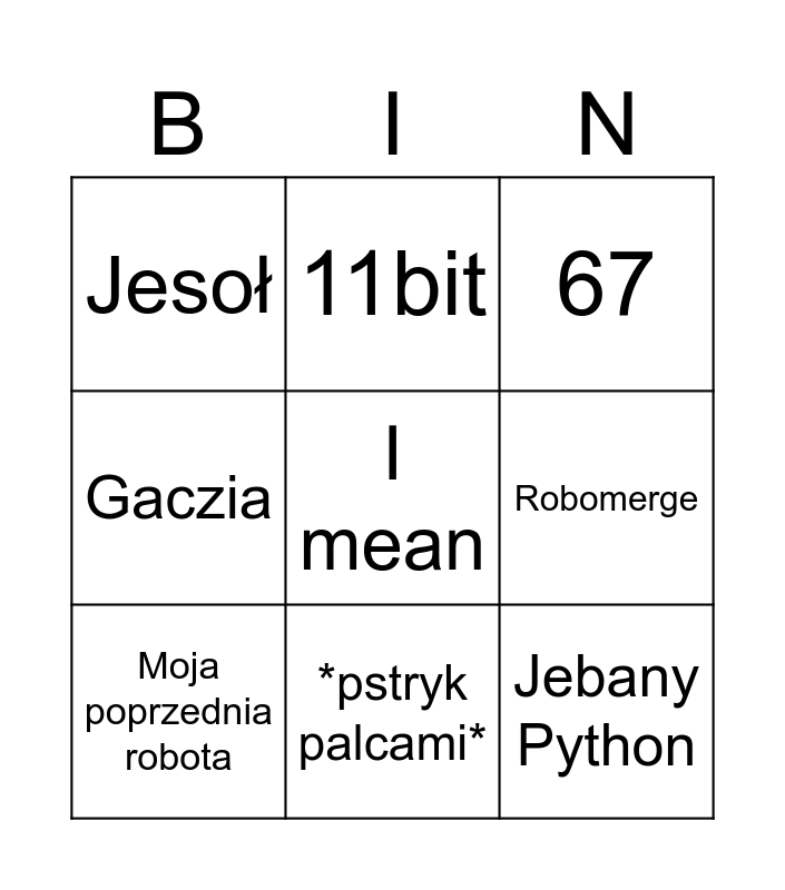 This bingo card has a free space and 8 words: Robomerge, 67, 11bit, Moja poprzednia robota, Jesoł, Jebany Python, Gaczia and *pstryk palcami*.