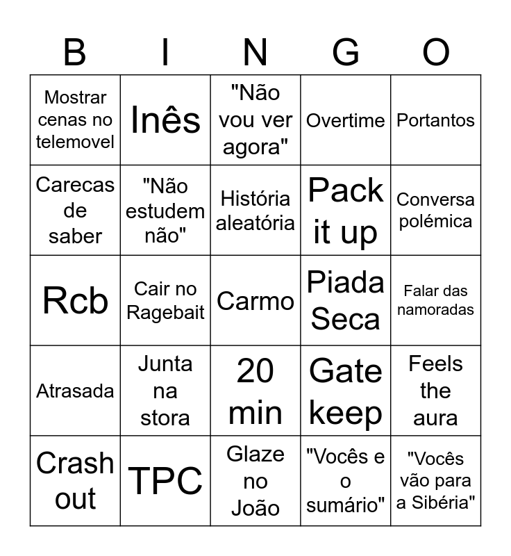 This bingo card has a free space and 29 words: Crash out, Dar Ragebait, Cair no Ragebait, Falar do Filho, Mostrar cenas no telemovel, "Não vou ver agora", "Não estudem não", Junta na stora, Piada Seca, TPC, Falar das namoradas, "Vocês vão para a Sibéria", Glaze no João, "Vocês e o sumário", Conversa polémica, Overreact, 20 min, Atrasada, Portantos, Rcb, Gate keep, Imagem de merda, Pack it up, Carecas de saber, Overtime, Inês, Feels the aura, História aleatória and Casa de banho.