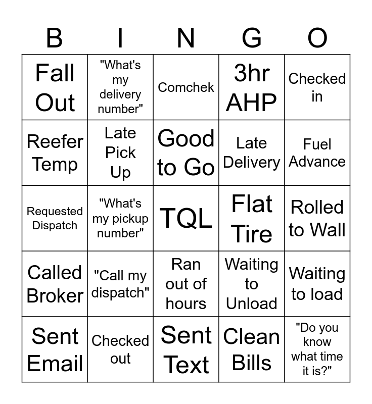 This bingo card has a free space and 24 words: "Call my dispatch", Checked out, Good to Go, Sent Email, Checked in, Fall Out, Reefer Temp, "What's my delivery number", Flat Tire, Ran out of hours, Late Delivery, Requested Dispatch, Waiting to Unload, Waiting to load, Late Pick Up, Clean Bills, Rolled to Wall, Comchek, Fuel Advance, "What's my pickup number", "Do you know what time it is?", Called Broker, 3hr AHP and Sent Text.