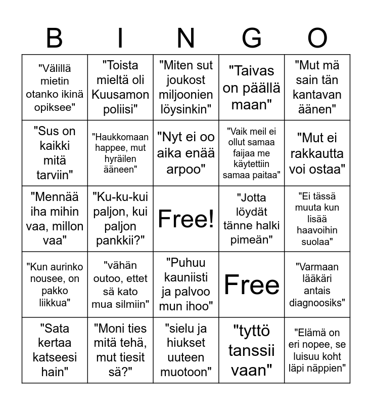 This bingo card has a free space and 25 words: "vähän outoo, ettet sä kato mua silmiin", "sielu ja hiukset uuteen muotoon", "Nyt ei oo aika enää arpoo", "Sata kertaa katseesi hain", "Mut mä sain tän kantavan äänen", "Välillä mietin otanko ikinä opiksee", "Sus on kaikki mitä tarviin", "Toista mieltä oli Kuusamon poliisi", "Jotta löydät tänne halki pimeän", "Puhuu kauniisti ja palvoo mun ihoo", "Vaik meil ei ollut samaa faijaa me käytettiin samaa paitaa", "Mennää iha mihin vaa, millon vaa", Free, "Varmaan lääkäri antais diagnoosiks", "Haukkomaan happee, mut hyräilen ääneen", "Keskellä vaan me kaksi", "Ei tässä muuta kun lisää haavoihin suolaa", "Miten sut joukost miljoonien löysinkin", "Mut ei rakkautta voi ostaa", "Ku-ku-kui paljon, kui paljon pankkii?", "Elämä on eri nopee, se luisuu koht läpi näppien", "Moni ties mitä tehä, mut tiesit sä?", "Kun aurinko nousee, on pakko liikkua", "Taivas on päällä maan" and "tyttö tanssii vaan".