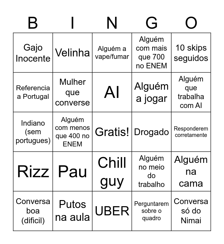 This bingo card has a free space and 24 words: Pau, Putos na aula, AI, Conversa boa (dificil), 10 skips seguidos, Gajo Inocente, Referencia a Portugal, Velinha, Drogado, Chill guy, Alguém a jogar, Indiano (sem portugues), Alguém no meio do trabalho, Alguém na cama, Mulher que converse, Perguntarem sobre o quadro, Responderem corretamente, Alguém a vape/fumar, Alguém que trabalha com AI, Alguém com menos que 400 no ENEM, Conversa só do Nimai, Rizz, Alguém com mais que 700 no ENEM and UBER.