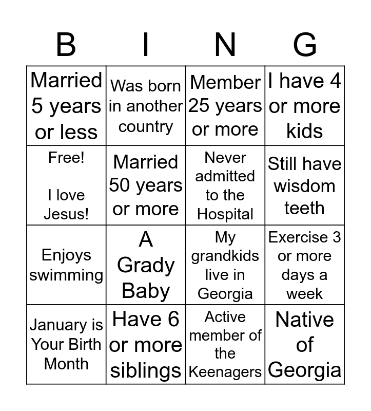This bingo card has 16 words: Have 6 or more siblings, Exercise 3 or more days a week, Member 25 years or more, Married 5 years or less, Enjoys swimming, Was born in another country, My grandkids live in Georgia, Active member of the Keenagers, Free! I love Jesus!, Married 50 years or more, January is Your Birth Month, I have 4 or more kids, A Grady Baby, Still have wisdom teeth, Never admitted to the Hospital and Native of Georgia.