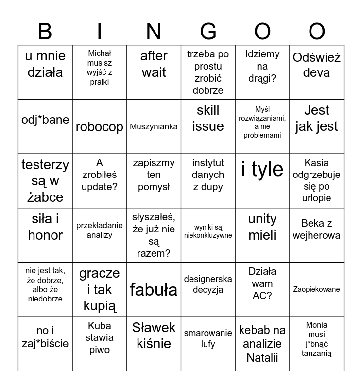 This bingo card has 36 words: designerska decyzja, fabuła, smarowanie lufy, odj*bane, siła i honor, instytut danych z dupy, robocop, Sławek kiśnie, Idziemy na drągi?, Działa wam AC?, Jest jak jest, trzeba po prostu zrobić dobrze, Zaopiekowane, A zrobiłeś update?, skill issue, u mnie działa, nie jest tak, że dobrze, albo że niedobrze, i tyle, testerzy są w żabce, after wait, zapiszmy ten pomysł, przekładanie analizy, wyniki są niekonkluzywne, słyszałeś, że już nie są razem?, unity mieli, Michał musisz wyjść z pralki, Myśl rozwiązaniami, a nie problemami, Kuba stawia piwo, Muszynianka, Odśwież deva, Monia musi j*bnąć tanzanią, no i zaj*biście, Beka z wejherowa, Kasia odgrzebuje się po urlopie, gracze i tak kupią and kebab na analizie Natalii.