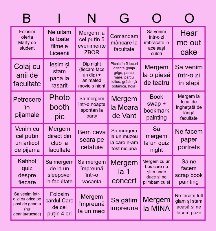 This bingo card has 36 words: Venim cu cel puțin un articol de pijama, Mergem direct din club la facultate, Mergem împreună la un meci, Picnic în 5 locuri diferite (plaja grigo, parcul mare, parcul iulius, grădiniță botanica, hoia), Book swap + bookmark painting, Mergem la locul de înghețată de lângă facultate, Folosim oferta Marty de student, Folosim cardul Caro de cel puțin 4 ori, Mergem la cel puțin 5 evenimente ZBOR, Mergem la 1 concert, Mergem la o piesă de teatru, Hear me out cake, Kahhot quiz despre fiecare, Photo booth pic, Dip night (fiecare face un dip) + animated movie s night, Comandam mâncare la facultate, Mergem cu un bus care nu știm unde duce și ne plimbam cu el, Ne facem paper portrets, Colaj cu anii de facultate, Ieșim și stam pana la rasarit, Bem ceva seara pe cetatuie, Sa mergem la un muzeu la care n-am fost niciuna, Sa mergem la un quiz night, Sa ne facem scrap book painting, Petrecere în pijamale, Ne uitam la toate filmele Liceenii, Sa mergem într-o noapte spontan la party, Sa gătim impreuna, Sa venim într-o zi îmbrăcate in aceleași culori, Sa venim într-o zi în slapi, Sa venim într-o zi cu orice pe post de geanta (nu geanta/rucsac), Sa mergem de la un sleepover la facultate, Sa mergem împreună într-o vacanta, Mergem la Moara de Vant, Mergem la MINA and Ne facem full glam și stam acasă și ne facem poze.