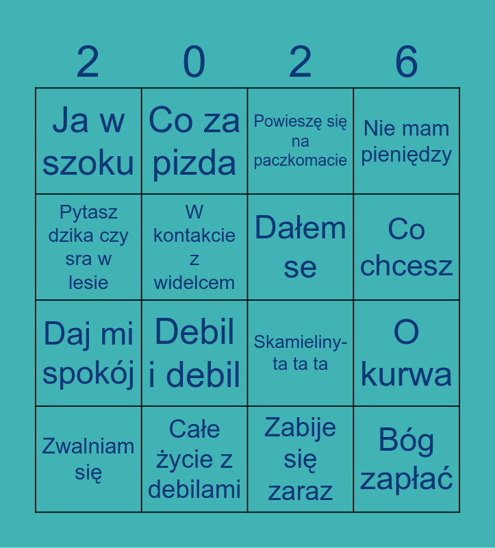 This bingo card has 16 words: Całe życie z debilami, O kurwa, Powieszę się na paczkomacie, Ja w szoku, Daj mi spokój, Co za pizda, Skamieliny- ta ta ta, Zabije się zaraz, Pytasz dzika czy sra w lesie, W kontakcie z widelcem, Zwalniam się, Nie mam pieniędzy, Debil i debil, Co chcesz, Dałem se and Bóg zapłać.