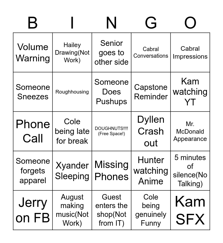 This bingo card has a free space and 24 words: Xyander Sleeping, August making music(Not Work), Someone Does Pushups, Jerry on FB, Cabral Impressions, Volume Warning, Someone Sneezes, Hailey Drawing(Not Work), Dyllen Crash out, Missing Phones, Capstone Reminder, Phone Call, Hunter watching Anime, 5 minutes of silence(No Talking), Roughhousing, Cole being genuinely Funny, Mr. McDonald Appearance, Senior goes to other side, Kam watching YT, Cole being late for break, Kam SFX, Someone forgets apparel, Cabral Conversations and Guest enters the shop(Not from IT).