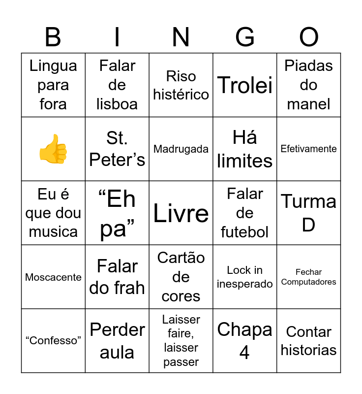 This bingo card has a free space and 29 words: “Confesso”, “malta”, “Eh pa”, Mochila na mesa, Lingua para fora, Riso histérico, St. Peter’s, Falar do frah, Falar de futebol, Perder aula, Turma D, Contar historias, Laisser faire, laisser passer, Chapa 4, Efetivamente, Sala abafada, Cartão de cores, Moscacente, Piadas do manel, Eu é que dou musica, Lock in inesperado, Conforme se toca conforme se dança, Há limites, 👍, Trolei, Falar de lisboa, Fechar Computadores, Madrugada and Falar do parceiro.