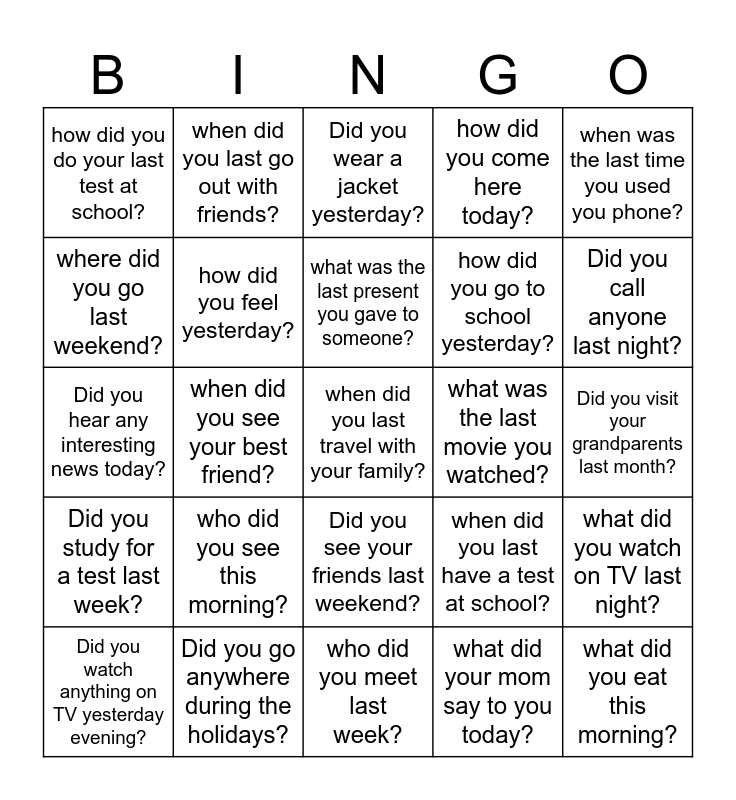 This bingo card has a free space and 49 words: what did you do yesterday?, what did you eat this morning?, what did you drink for breakfast?, who did you meet last week?, who did you see this morning?, when did you visit your grandparents?, when did you last go out with friends?, what did you have for dinner last night?, where did you go last weekend?, why did you come here today?, how did you feel yesterday?, how did you come here today?, what did you watch on TV last night?, when did you last have a test at school?, what did you buy last month?, when did you last go to a birthday party?, what was the last present you gave to someone?, what was the last movie you watched?, where were you this morning?, when was the last time you used you phone?, when did you see your best friend?, what did your mom say to you today?, how did you do your last test at school?, how did you go to school yesterday?, Did you finish your homework yesterday?, Did you call anyone last night?, Did you watch anything on TV yesterday evening?, Did you go to school yesterday?, Did you see your friends last weekend?, Did you study for a test last week?, Did you play any video games yesterday?, Did you clean your room yesterday?, Did you eat breakfast this morning?, Did you buy anything last week?, Did you go anywhere during the holidays?, Did you send any messages yesterday?, Did you take the bus to school this morning?, Did you make anything to eat last night?, Did you visit your grandparents last month?, Did you break anything yesterday?, Did you read anything last month?, Did you win any game last week?, Did you find anything interesting yesterday?, Did you draw anything yesterday?, Did you hear any interesting news today?, Did you wear a jacket yesterday?, Did you leave the house early this morning?, Did you meet anyone new last weekend? and Did you have a good weekend last week?.